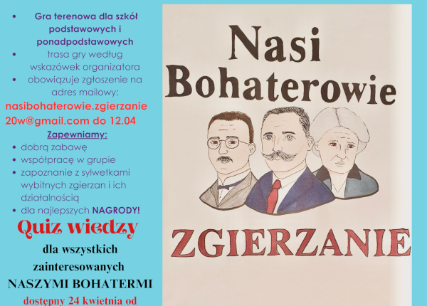 Uczniowie Zgierskiego Zespołu Szkół Ponadpodstawowych im. Jana Pawła II zapraszają do udziału w organizowanych przez nich wydarzeniach, w ramach realizacji projektu edukacyjnego Instytutu Pamięci Narodowej SILNI POLSKĄ, pod hasłem: „Nasi bohaterowie – ZGIERZANIE.” Przygoda czeka! Dołącz do gry terenowej i quizu! Lubisz wyzwania? Chcesz sprawdzić swoją wiedzę i spryt, a przy tym świetnie się bawić? Zapraszamy na grę terenową oraz