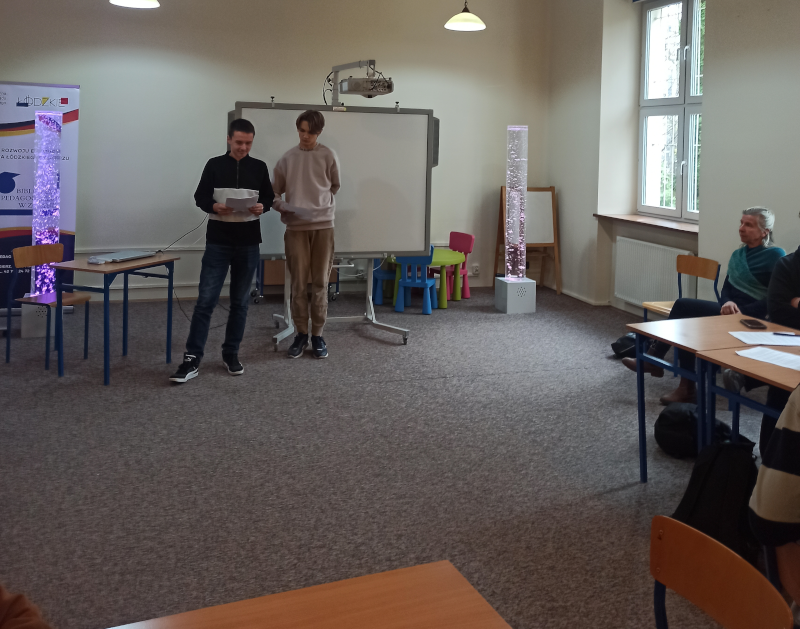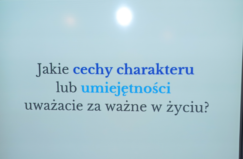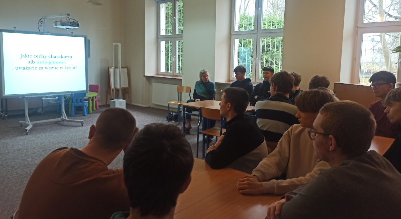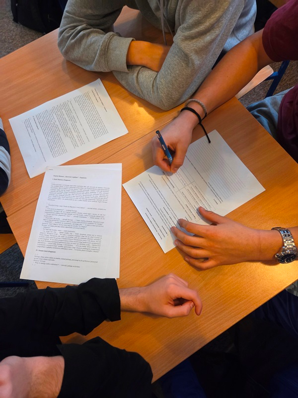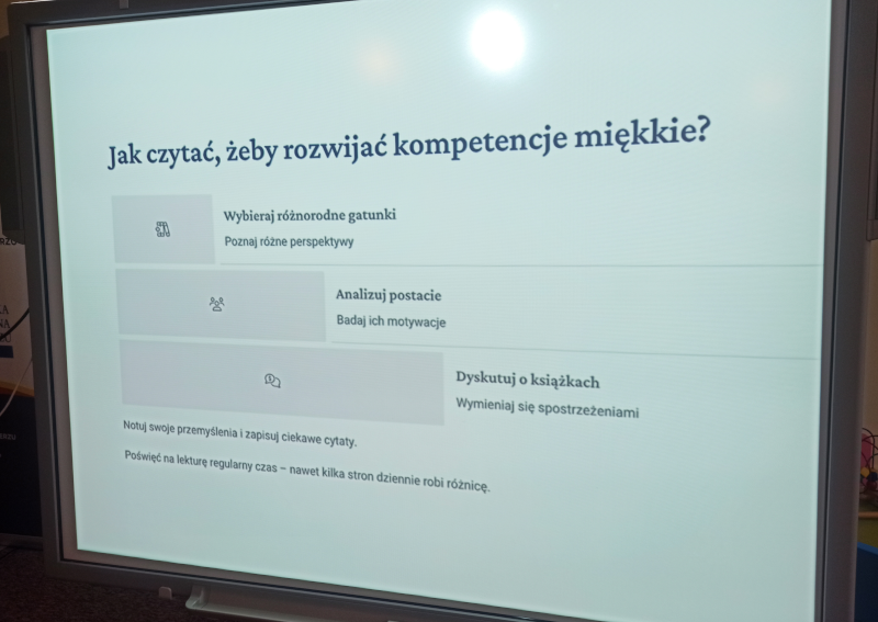 W pierwszej części spotkania młodzież obejrzała krótką, angażującą prezentację poświęconą roli literatury w rozwijaniu kompetencji miękkich. Następnie uczniowie pracowali z wybranymi fragmentami literackimi – analizowali postawy bohaterów, rozpoznawali emocje i wartości, a także odkrywali, w jaki sposób literatura pomaga lepiej rozumieć siebie i innych.