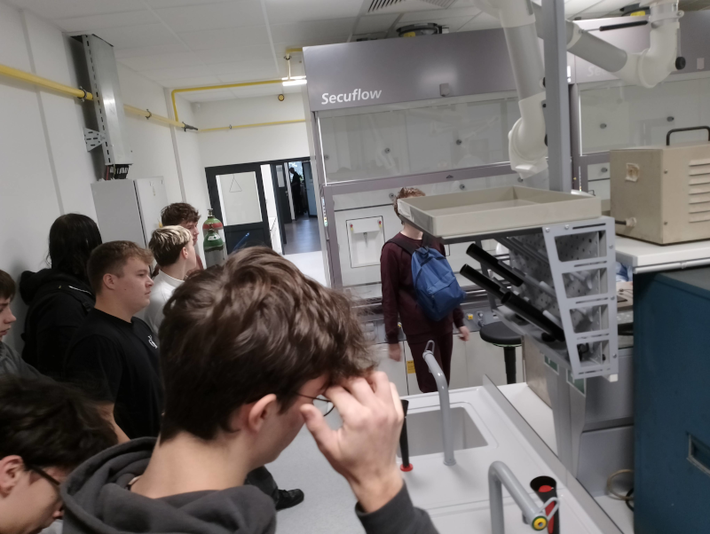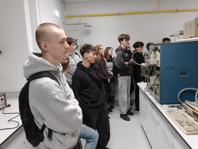 Pierwszym punktem programu było zwiedzanie Wydziału Chemicznego, gdzie uczniowie mogli zobaczyć nowoczesne laboratoria oraz poznać kierunki prowadzone przez wydział. Pracownicy uczelni opowiadali o prowadzonych badaniach, możliwościach rozwoju oraz praktycznym zastosowaniu chemii w przemyśle i nowoczesnych technologiach.