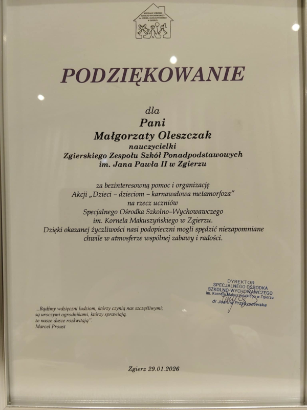 Dziękujemy dyrekcji i wychowankom SOSW w Zgierzu, za ciepłe przyjęcie i wspólną, pełną energii zabawę.