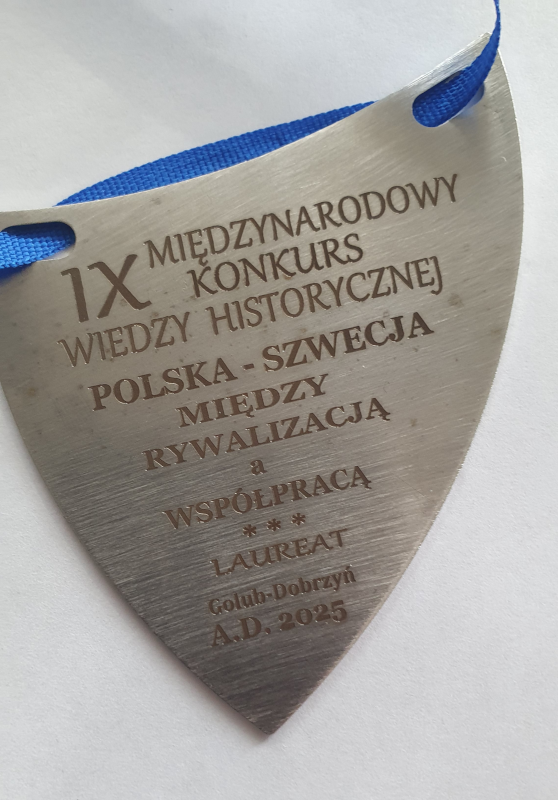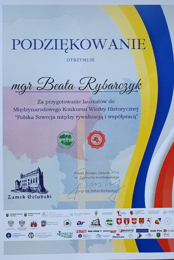 Alicja Szeluga z klasy 5TOF została laureatką w IX Edycji Międzynarodowego Konkursu Wiedzy Historycznej “Polska – Szwecja, między rywalizacją a współpracą” w kategorii prace plastyczne. Uroczysta gala finałowa, podczas, której wręczano nagrody, odbyła się w zbudowanym w XIV wieku przez Krzyżaków Zamku Golubskim. Alicja odbierała nagrodę wraz ze swoim opiekunem panią Beatą Rybarczyk.