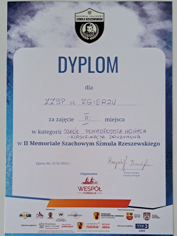 Z radością informujemy, że nasza drużyna zajęła drugie miejsce w klasyfikacji drużynowej na II Memoriale Szmula Rzeszewskiego. Ponadto, w klasyfikacji indywidualnej, Kai Borek uczeń klasy 3TIP zajął trzecie miejsce. Memoriał zgromadził liczną grupę zawodników. Wysoki poziom rywalizacji sprawił, że zawody były wyjątkowo trudne, a konkurencja bardzo silna.