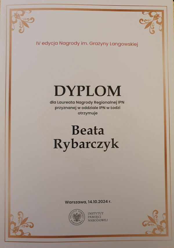 Oddział Instytutu Pamięci Narodowej w Łodzi tegoroczną Nagrodę Regionalną im. Grażyny Langowskiej, wybitnej nauczycielki, działaczki NSZZ „Solidarność” i posłanki na Sejm RP, przyznał pani Beacie Rybarczyk, naszemu nauczycielowi historii.