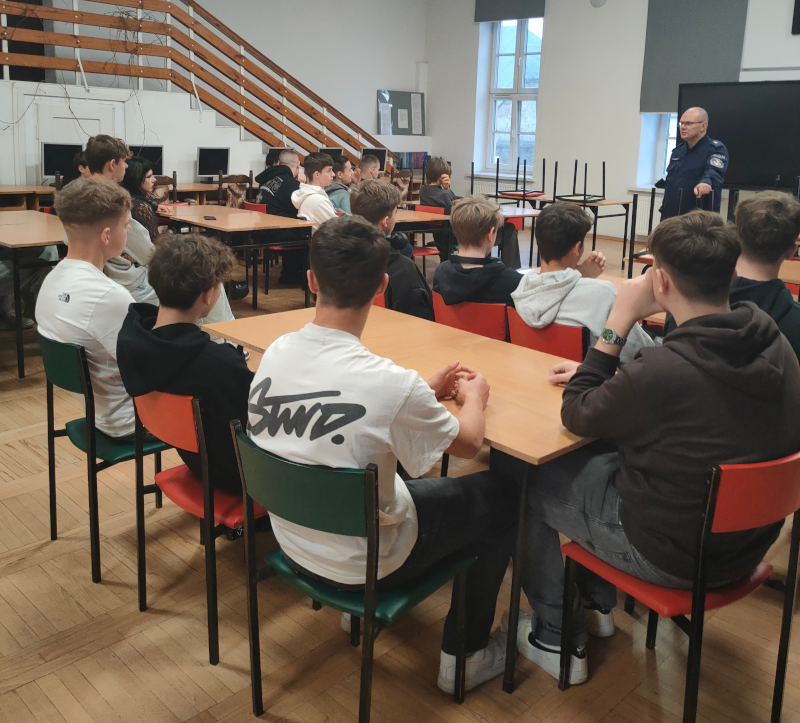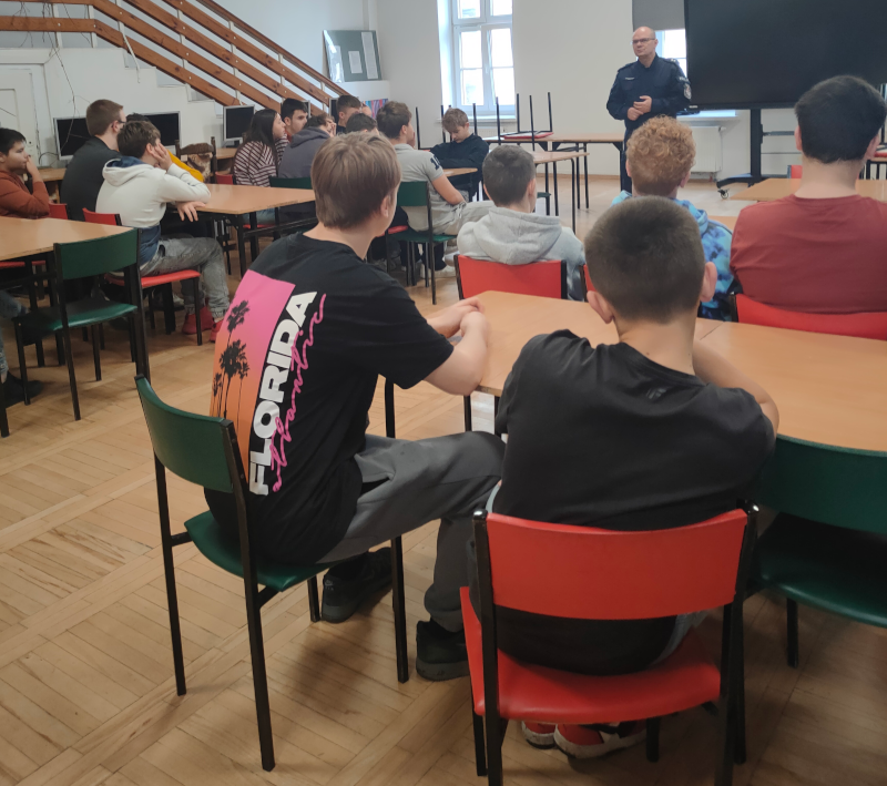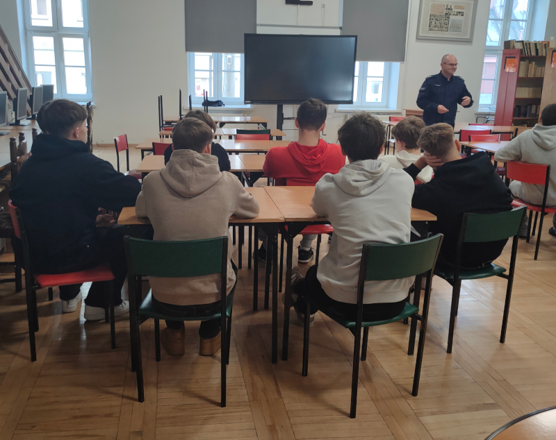 Po raz kolejny uczniowie klas pierwszych i drugich wzięli udział w zajęciach dotyczących bezpieczeństwa, które poprowadził podkomisarz Robert Borowski ze zgierskiej Policji. Naszym uczniom bardzo spodobał się jego ciekawy, a momentami humorystyczny sposób przekazywania wiedzy — było i poważnie, i z uśmiechem!