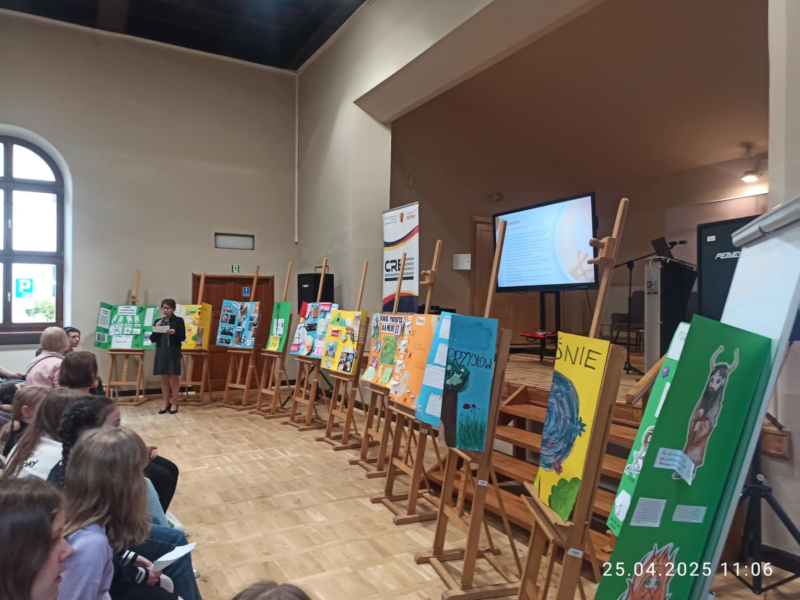 W drugiej części spotkania odbyły się warsztaty tworzenia lapbooków – kolorowych, składanych książek podsumowujących literackie podróże uczniów. Reprezentacje szkół pracowały z ogromnym zaangażowaniem i pomysłowością, a efekty ich pracy zostały wyeksponowane na sztalugach. Uczestnicy chętnie prezentowali swoje dzieła, dzieląc się inspiracjami, emocjami i refleksjami, jakie towarzyszyły im podczas pracy twórczej.