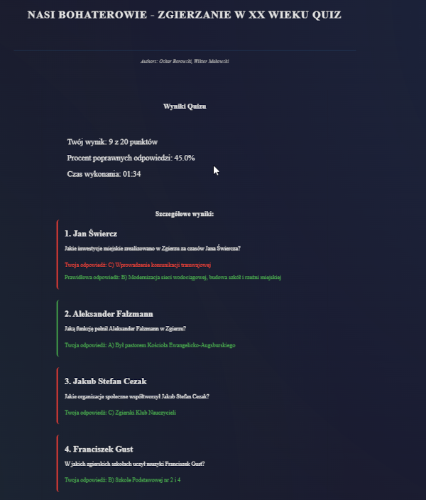 Podsumowaniem działań i zdobytych w czasie przygotowań do gry miejskiej i  quizu informacji, jest  stworzenie autorskiej gry planszowej pod tym samym tytułem, którą można wykorzystać na lekcjach historii aby poznać lokalnych bohaterów.