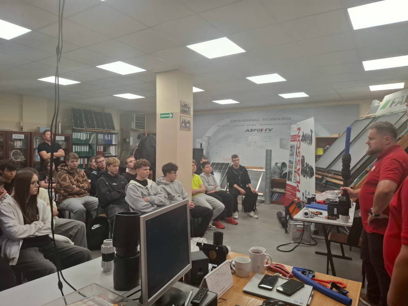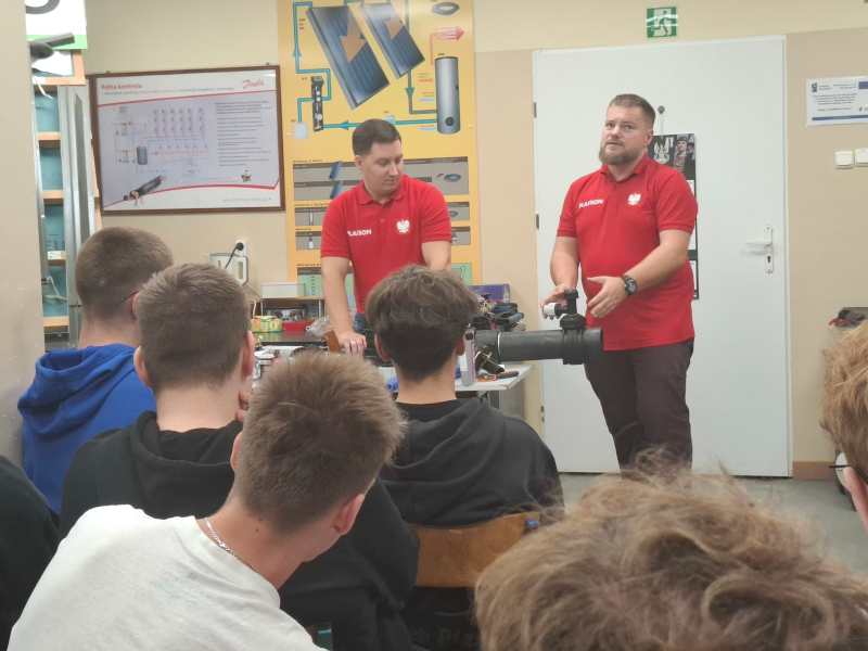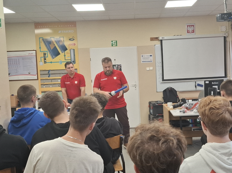 PLASSON to światowej klasy producent wyrobów z tworzyw sztucznych, przeznaczonych do sieci wodociągowych, gazowych i przemysłowych. W czasie szkolenia uczniowie mogli m.in. zobaczyć w realu proces zgrzewania rur o średnicy 80 mm za pomocą zgrzewarki elektrooporowej, samodzielnie przygotować rury do zgrzewu – usuwając wierzchnią warstwę za pomocą elektrycznego skrobaka obrotowego oraz zwizualizować wykonanie przyłącza wodociągowego za pomocą opaski siodłowej (bez konieczności przecinania przewodów sieci wodociągowej). Ponadto zapoznali się z obszernym asortymentem kształtek, złączek skręcanych oraz wciskanych PUSH-FIT – do szybkiego montażu bez konieczności stosowania gwintownicy lub zgrzewarki. Dzięki uprzejmości przedstawicieli firmy, baza materiałów dydaktycznych wzbogaciła się o całą gamę produktów firmy PLASSON – z najbardziej nowoczesnych technologii.