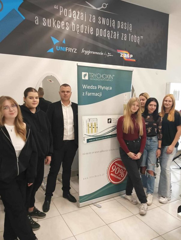 Rozpoczął się cykl szkoleń z zakresu trychologii. W warsztatach szkoleniowych uczestniczyła grupa uczennic technikum fryzjerskiego z klasy 5T0F. Zajęcia mają na celu zdobywanie wiedzy w ważnej dziedzinie jaką jest trychologia. Pan Mateusz Pajor, szkoleniowiec z firmy Trychoxin dzielił się swoją wiedzę i doświadczeniem. Marka od 11 lat jest na profesjonalnym rynku fryzjerskim.