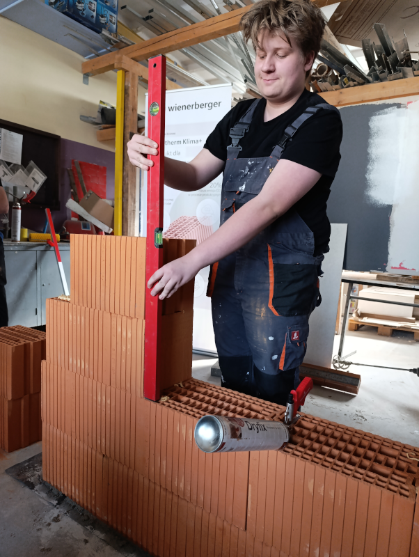 W części praktycznej uczniowie wykonali z elementów dostarczonych przez firmę Wienerberger ściankę – mur z otworem z wykorzystaniem systemowego nadproża. Dziękujemy panu Patrycjuszowi za przeprowadzenie szkolenia.