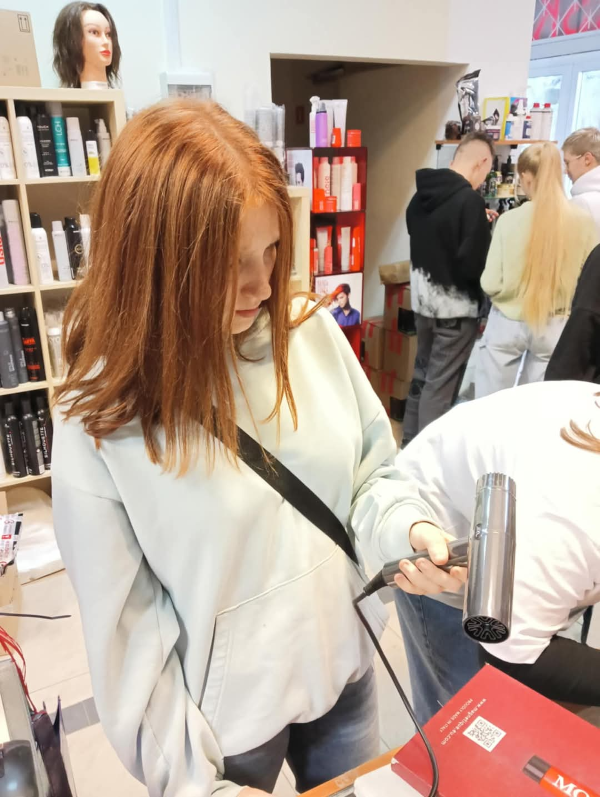 Dzięki pani Katarzynie, doświadczonemu ekspertowi i handlowcowi firmy, uczniowie mieli możliwość poznania nowoczesnych urządzeń oraz sprawdzenia ich w praktyce. To była świetna okazja, by poszerzyć wiedzę i umiejętności, a także zadawać pytania dotyczące aktualnych wyzwań w zawodzie fryzjera.